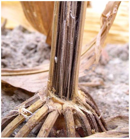Charcoal rot begins as a root infection which spreads into the lower stalk internodes and causes early ripening shredding and breaking at the crown of the corn stalk. Gibberella stalk rot is caused by the same fungus that is responsible for Gibberella ear rot on corn and Fusarium head blight of wheat and barley. Stalk rots are possible threat to corn.